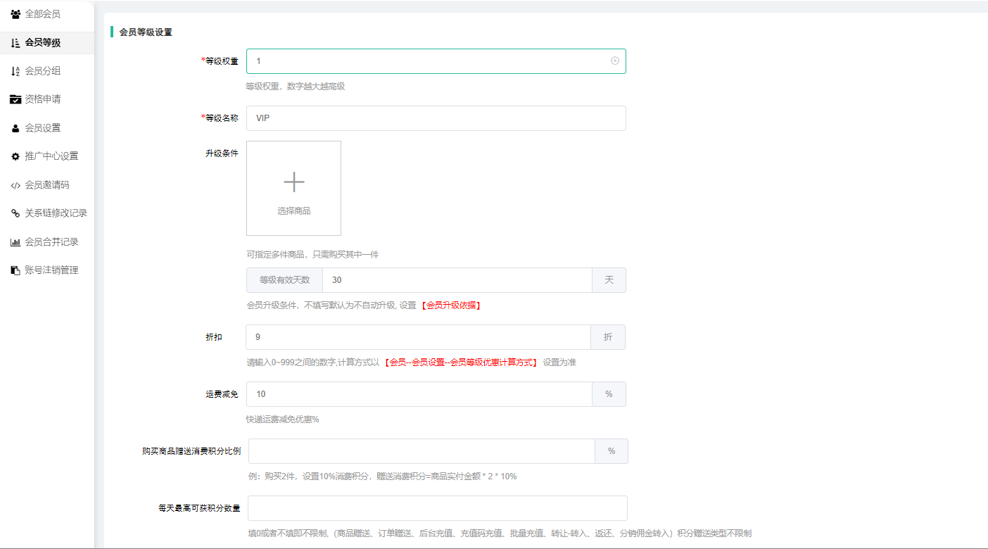 所有成为商城的会员等级为默认等级,可以通过后台-会员管理手动调整会员等级,也可以设置会员自动升级。