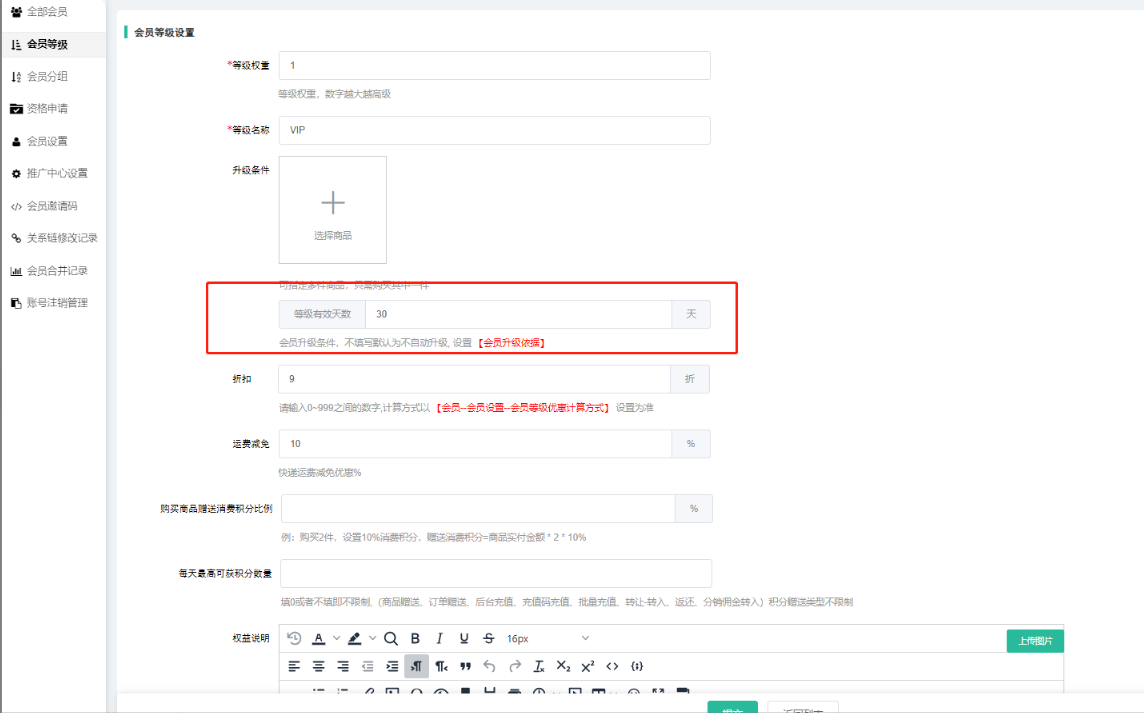 给某一等级会员的减价奖励优惠(值为空代表不设置折扣/减免运费)。用于会员专属促销活动。折扣运费减免可在前端会员等级权益页面显示,如下图