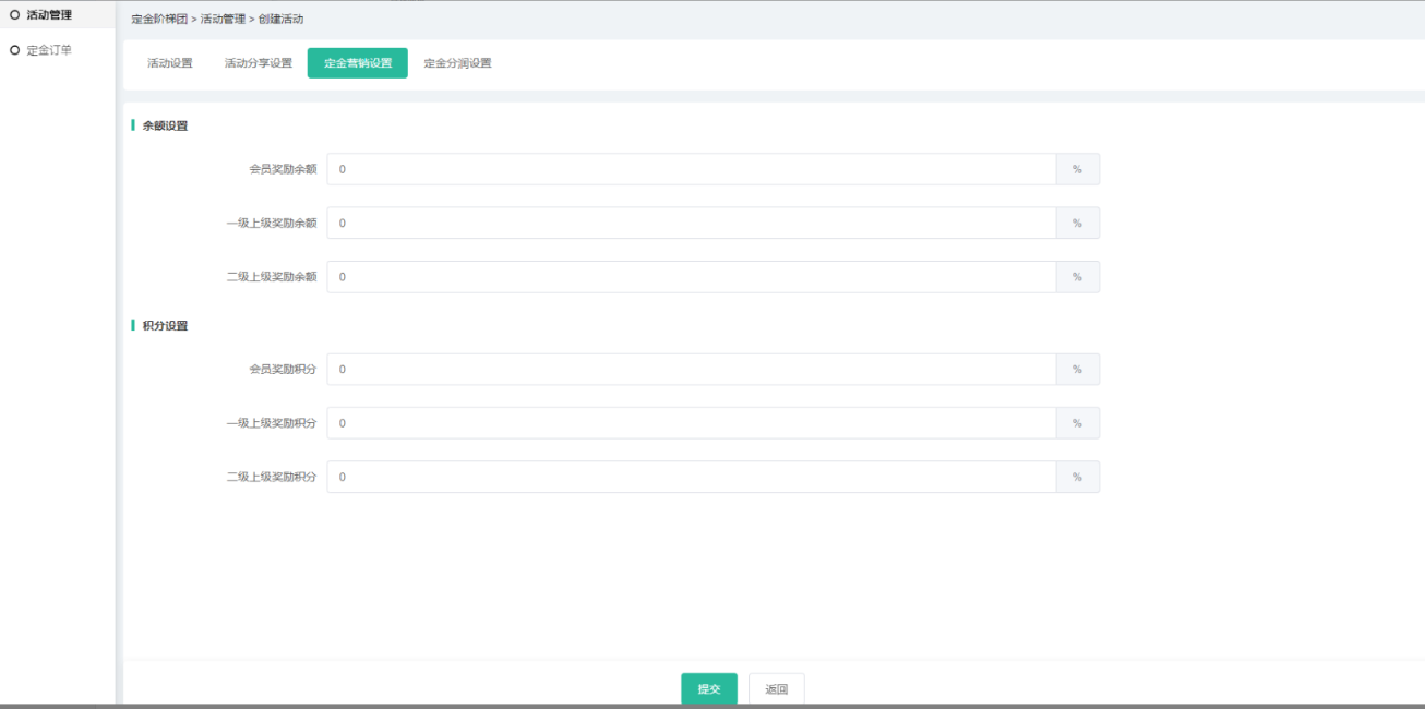 (4)营销设置和分润可设置活动定金的营销及分润信息,相应插件如未开启,则无法 设置,分润中所有插件都没开启则不会有分润设置导航;