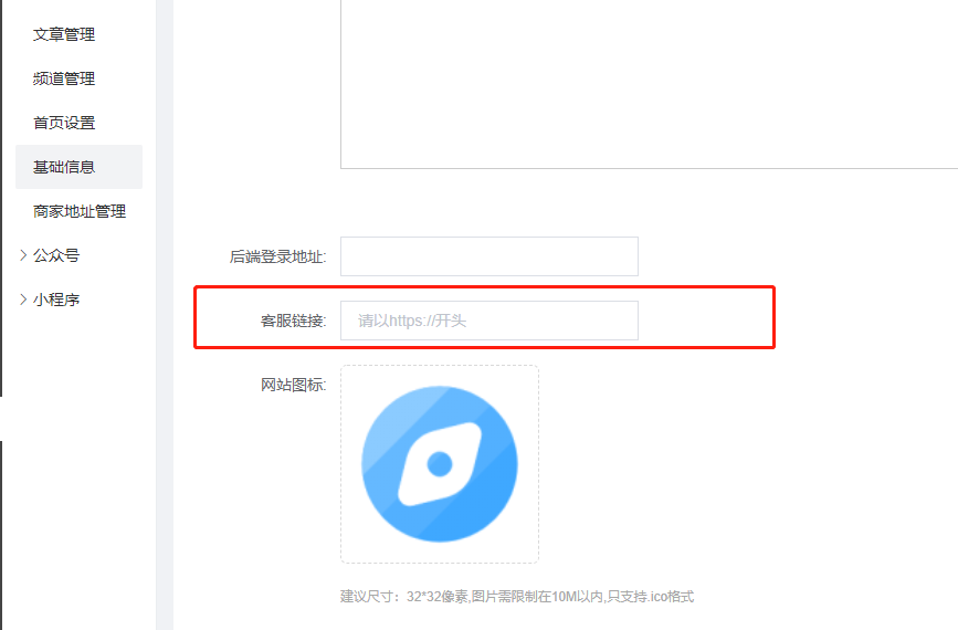 4.客服链接:可放置中台客服链接,填写以https:// 开头的客服链接,前端采购商城点击可跳转客服聊天页面;