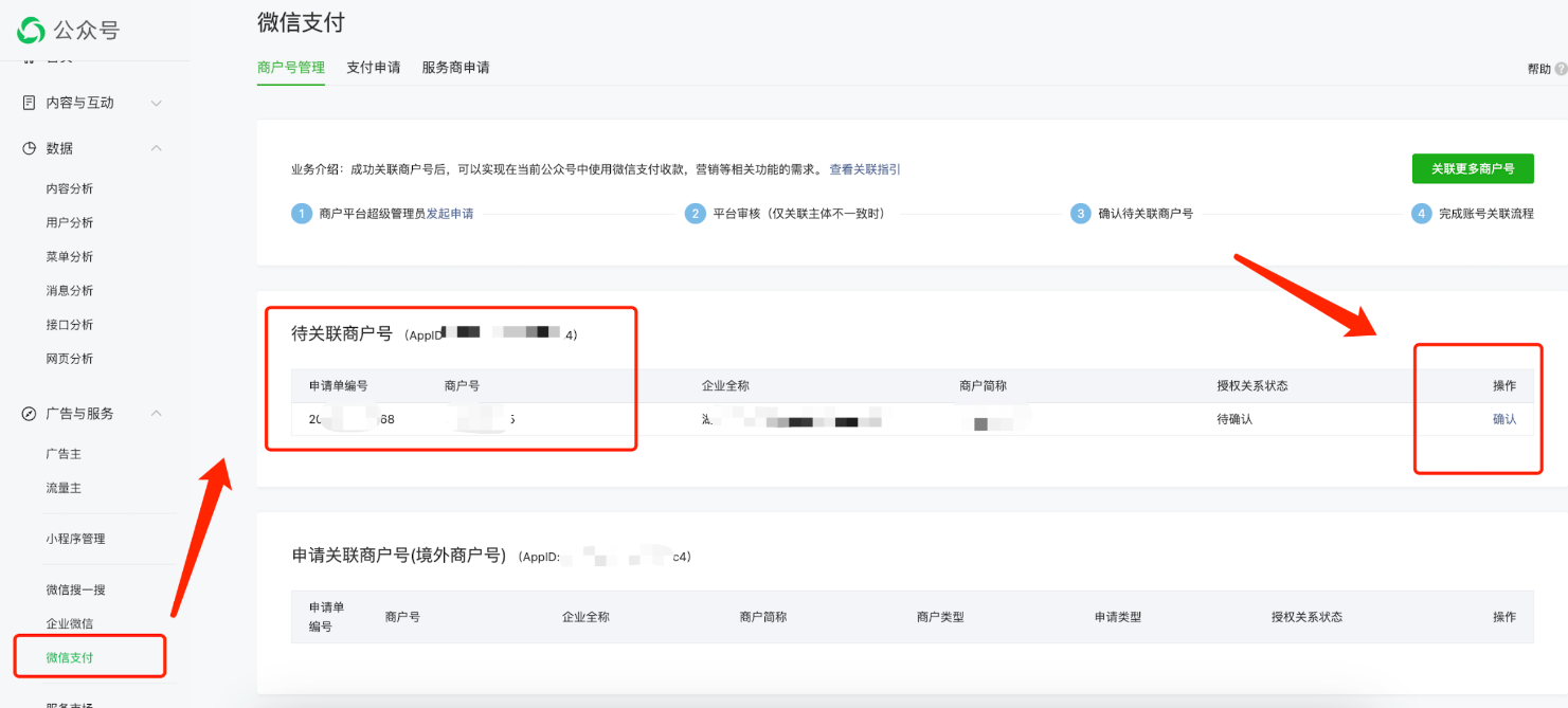 3、注意:微信支付的子商户(即门店的进账商户号)必须是通过服务商账号添加申请的,不能去关联其他服务商的子商户或者其他已开通好的子商户。