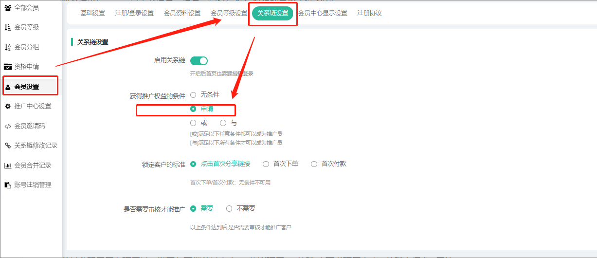 商家通过后台--会员关系设置,设置会员获得推广权限的资格条件为申请。
