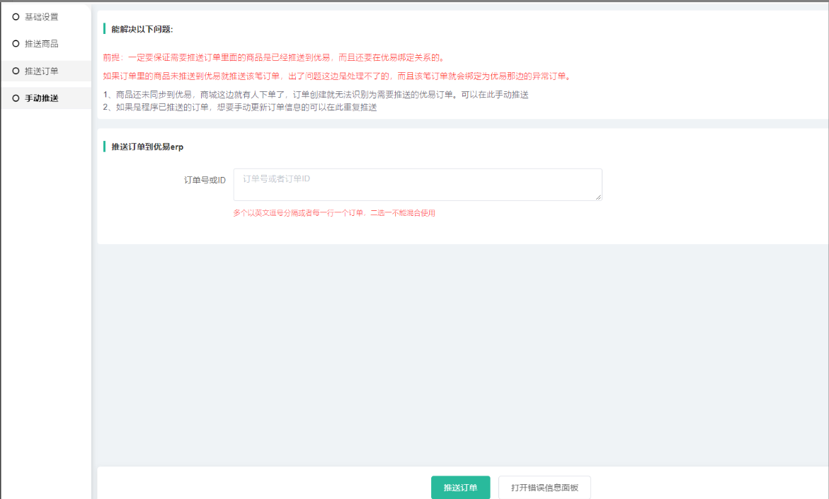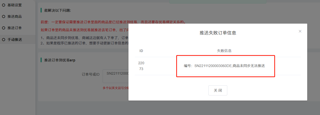 1)复制订单到订单列表搜索--进入订单对应的商品这个查看商品id,核实商品是否已经有推送了,如果是未推送该商品到优易平台那边,手动推送订单是无法推送成功的。
