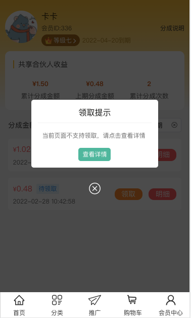 7、待领取的分成可点击领取分成