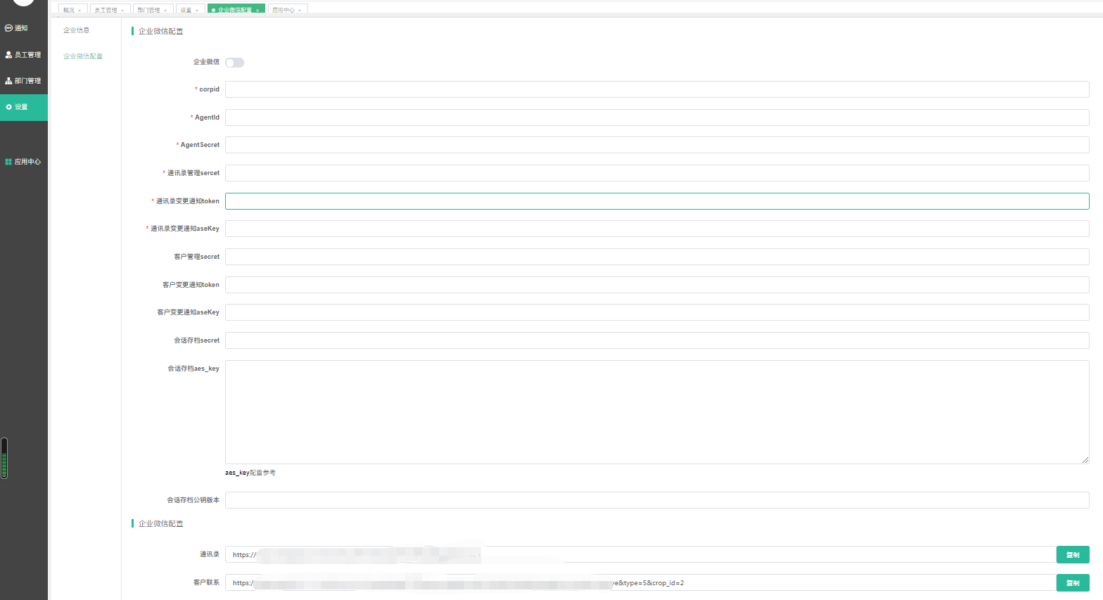 - 设置:查看当前企业具体信息、配置企业微信信息;