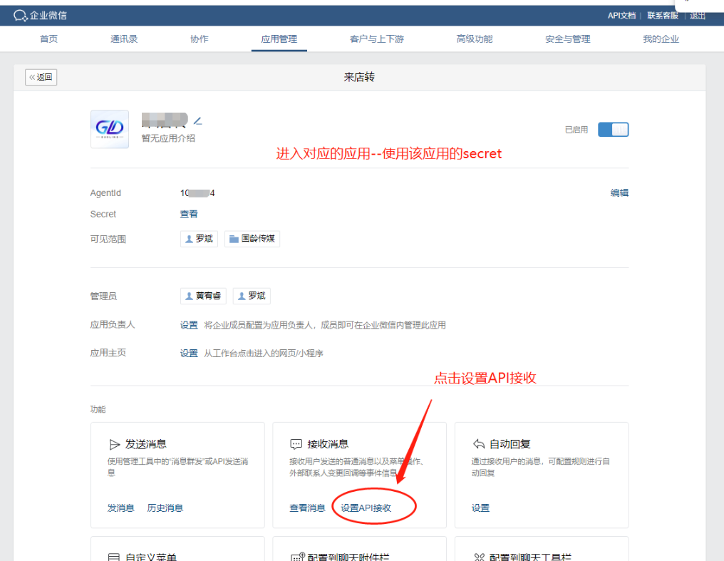 获取Secret,填写到企业微信PC端--设置--企业微信,通讯录管理sercet中;