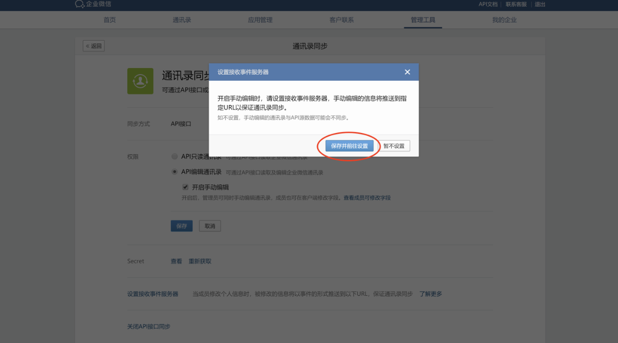 保存后提示设置接收事件服务器,直接点击保存并前往设置;