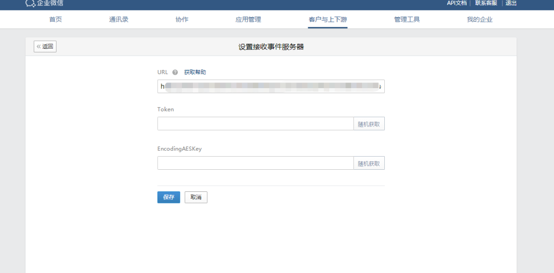 设置完成客户管理secret、客户变更通知token、客户变更通知aseKey后,请务必要先提交保存设置,在点击企业微信官方后台--客户联系中的设置接收事件服务器中的保存。