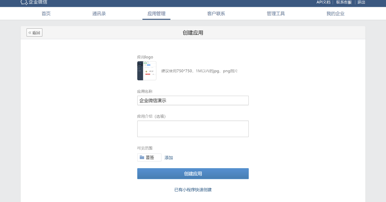 应用logo、名称、可见范围根据自己的情况自行填写即可。