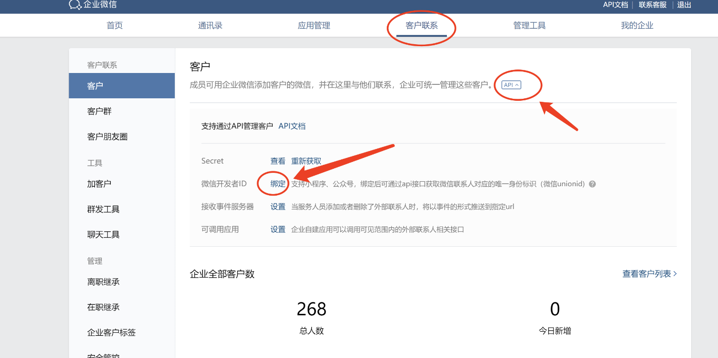 进入客户联系--客户,点击API--微信开发者ID--绑定,如下图: