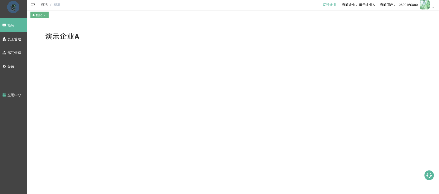 进入后页面为概况欢迎页,目前只显示企业名称,暂无其他内容。