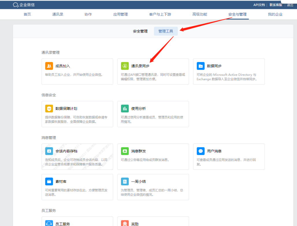 企业微信官方后台 -- 管理工具 -- 通讯录同步