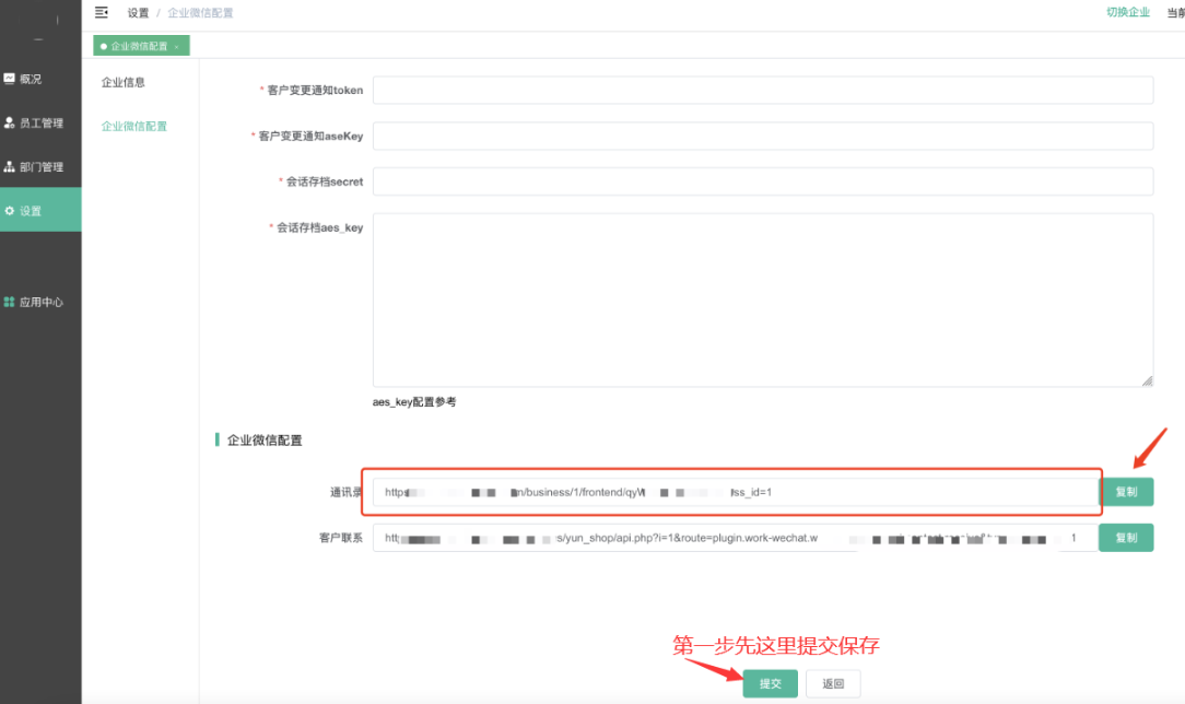Token:随机生成,并复制,填入企业管理PC端--设置--企业微信设置中的客户变更通知token中;