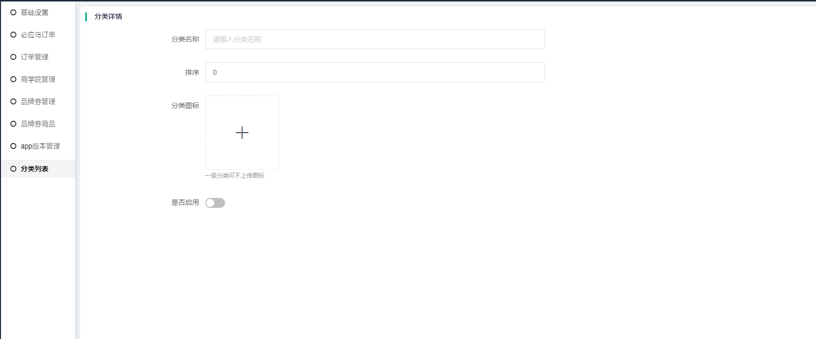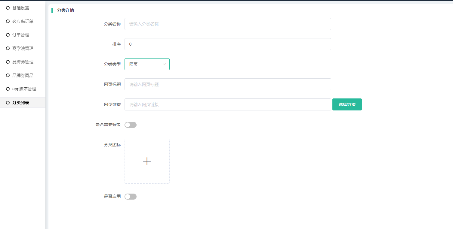 添加2级分类,名称、排序、图标、是否启用等规则同1、2级分类,关键在于区分不同的分类分类类型。