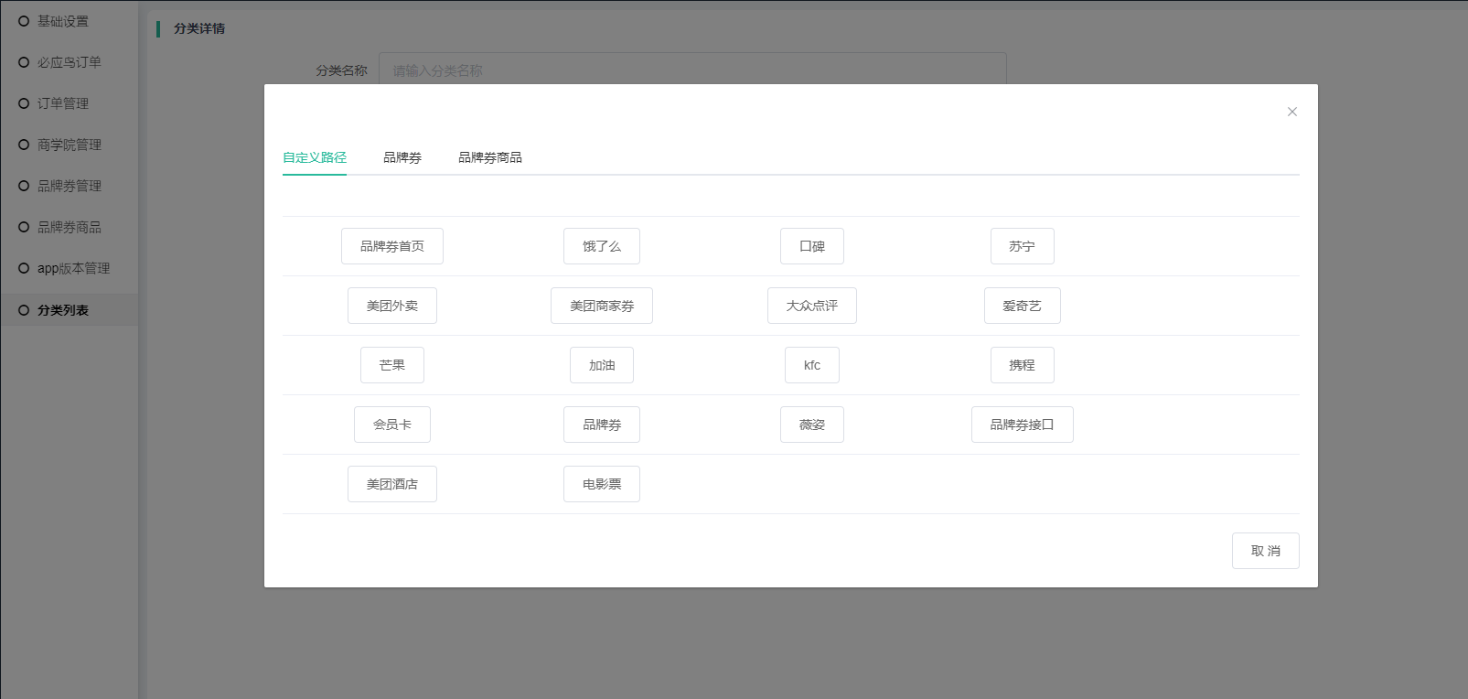 自定义、品牌券、品牌券商品三种分类类型性质一样,都是自定义跳转APP某一个原生的页面路径